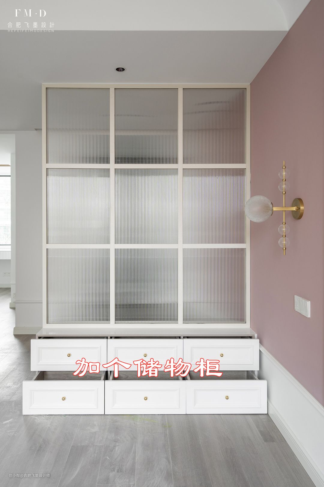 想要增加收纳,可以在玻璃隔断下加个储物柜,平时用来放放东西也是蛮方便的。