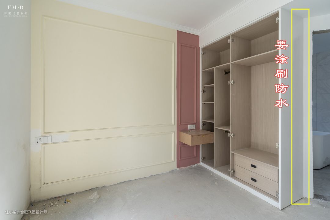PS:另外提醒一点,和卫生间相邻的墙面,如果要装衣柜的话,建议最好里外两面墙都将防水涂刷到位,这样就算时间再长,也不会有柜体生潮发霉的后顾之忧,多层防水多道保障,有啥不好呢。
