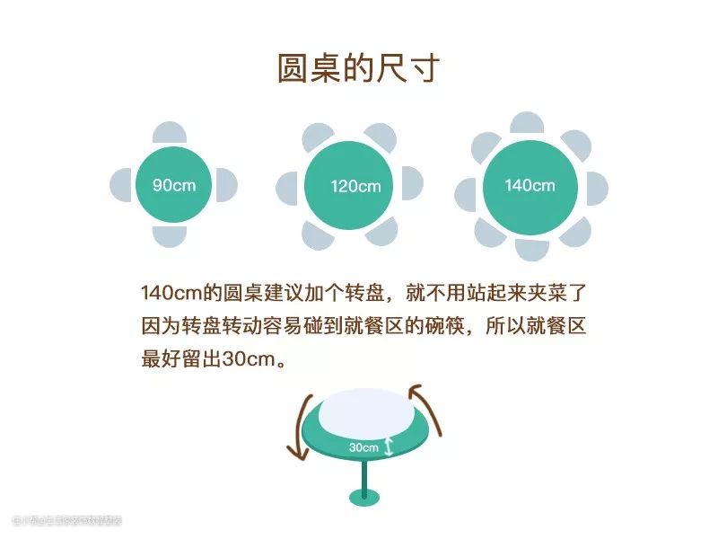 如果拥有视觉感较开阔的开放式或半开放式餐厅,我会建议选择圆形餐桌,圆形餐桌尺寸通常在直径五人位110cm、六人位125cm、八人位130cm、十人位150cm、十二人位180cm。