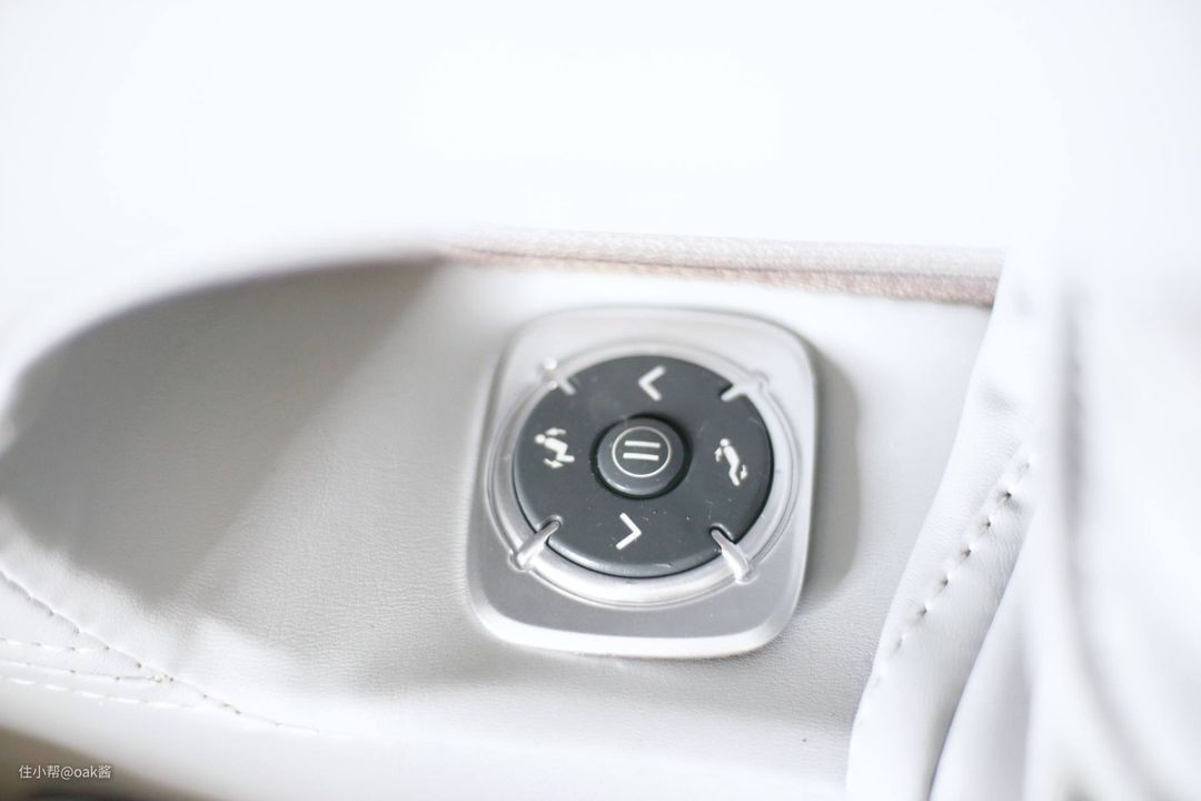 说到操控,按摩椅扶手右侧内部有一个手控区域,包括了力度调节,姿势前后调节,以及暂停等操作,即使在工作中也能用手指盲控。