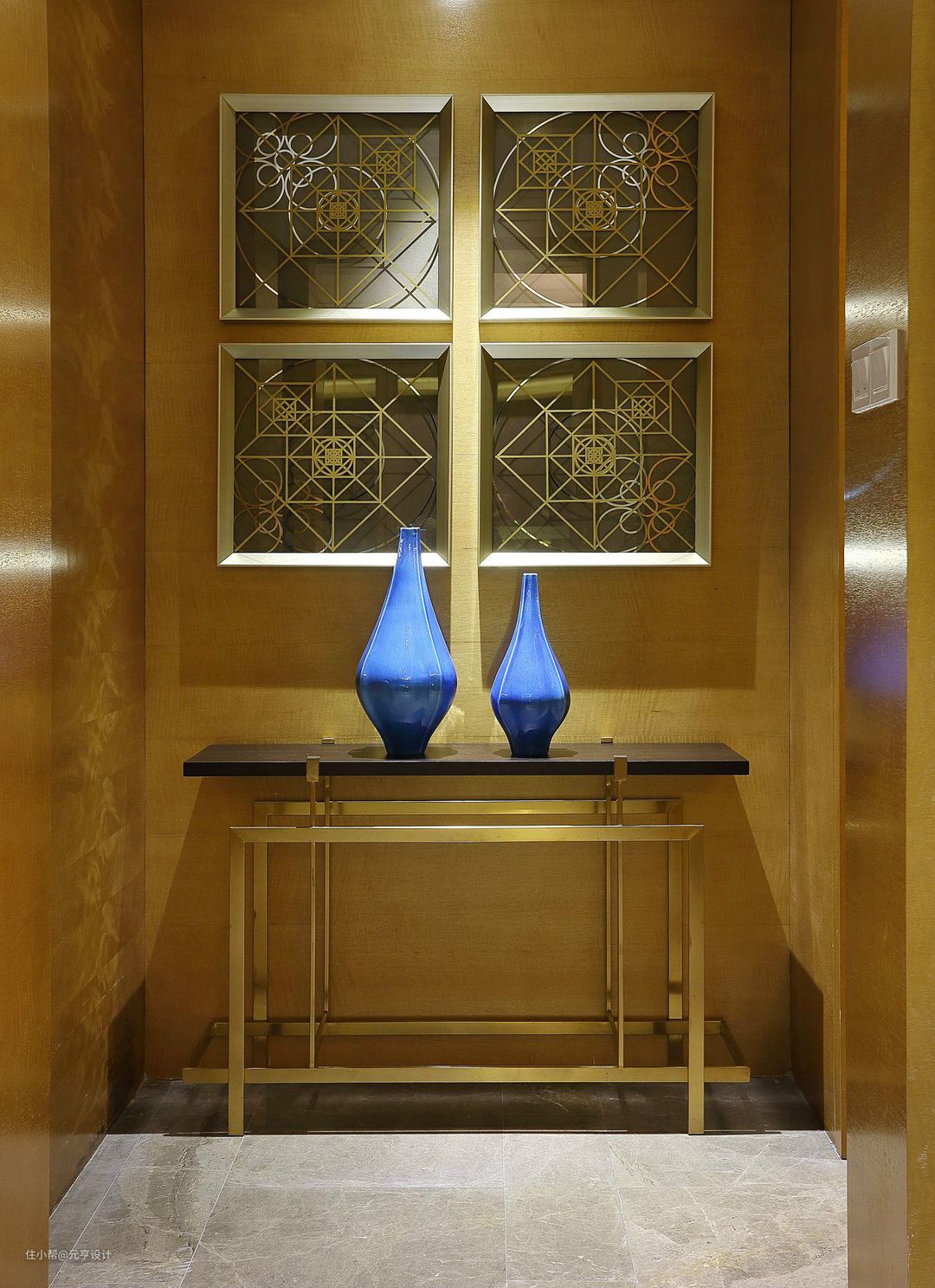 5、顶地灯呼应中规中矩,这种方法大多用于玄关比较规整方正的区域。