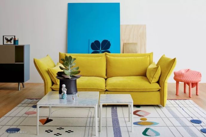 选用两种不同色彩的茶几与沙发,可以让你的客厅显得更有层次感,让室内空间显得更宽广、明亮,这种方法比较适用于一字型沙发,再搭配小型且具有几何感线条的茶几,能让空间更具张力。