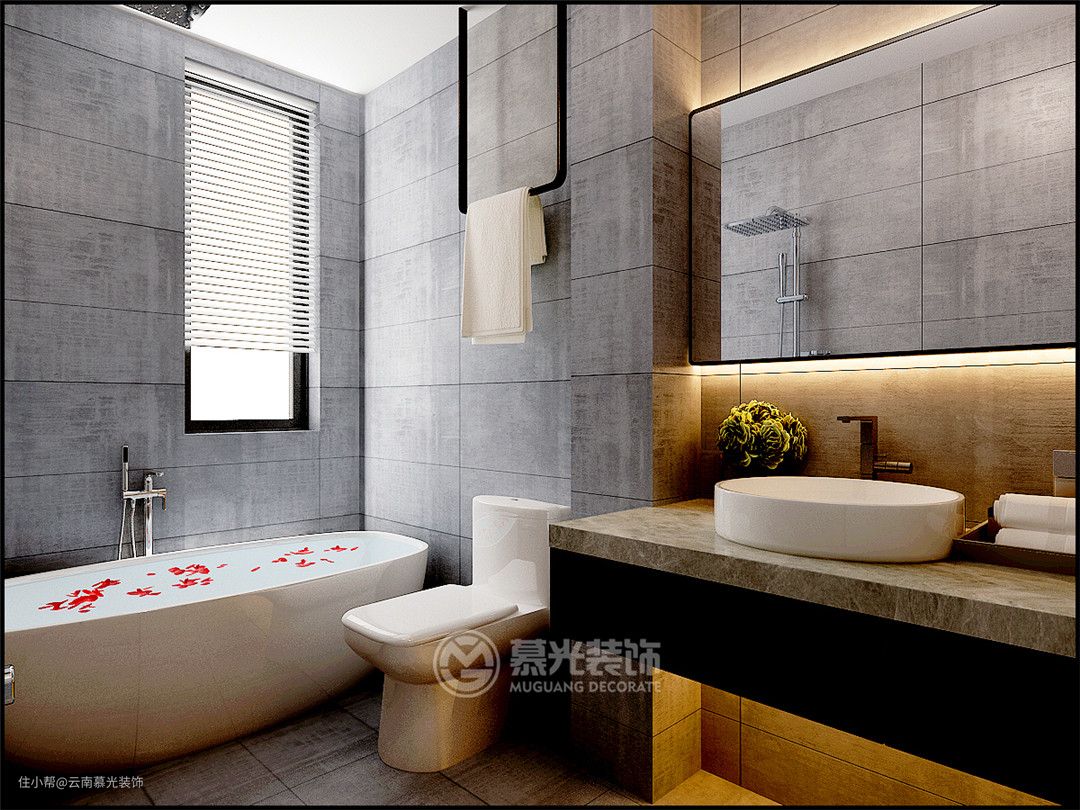 小而精致的卫生间,镜面设灯带,台下盆洗手池,便利美观,石材台面的储物空间,颜值与功能并存;如厕区设金属挂杆,收纳衣物、毛巾等,实用而不占空间。