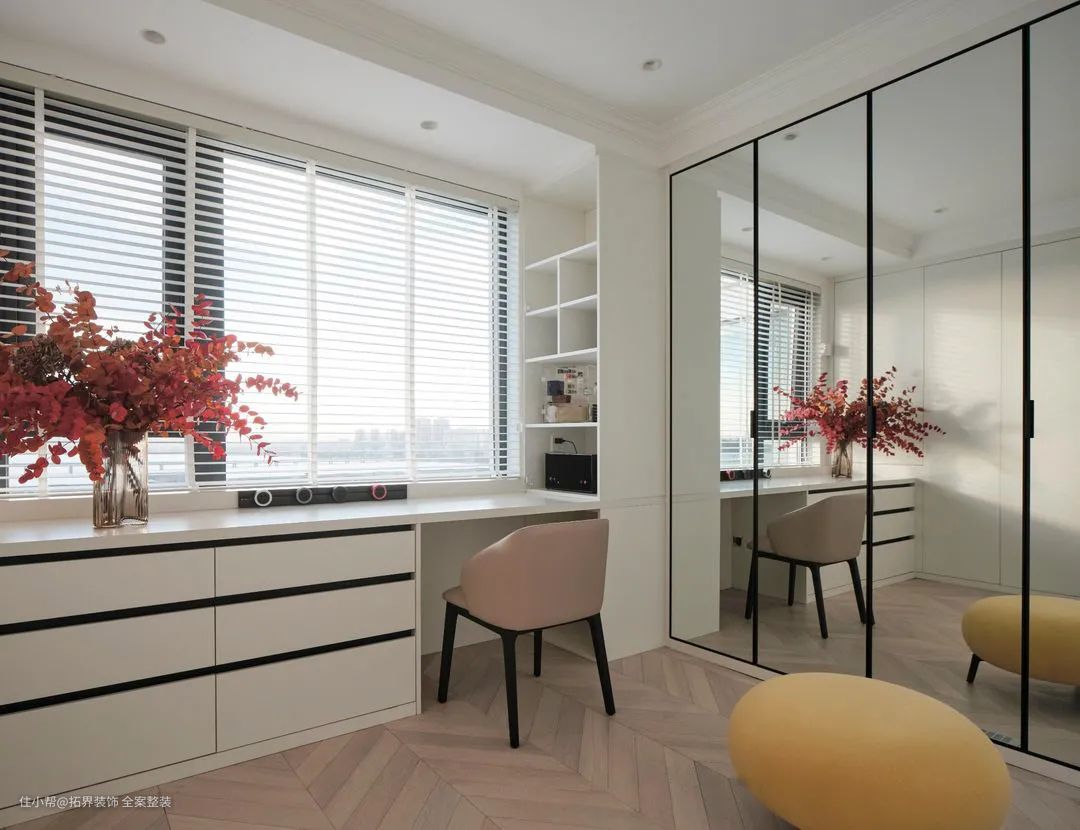 靠近飘窗的区域光线比较好,一般会将这里改造成书桌,而后面就可以两面环绕一个衣帽间,即作为书房又可以作为衣帽间。