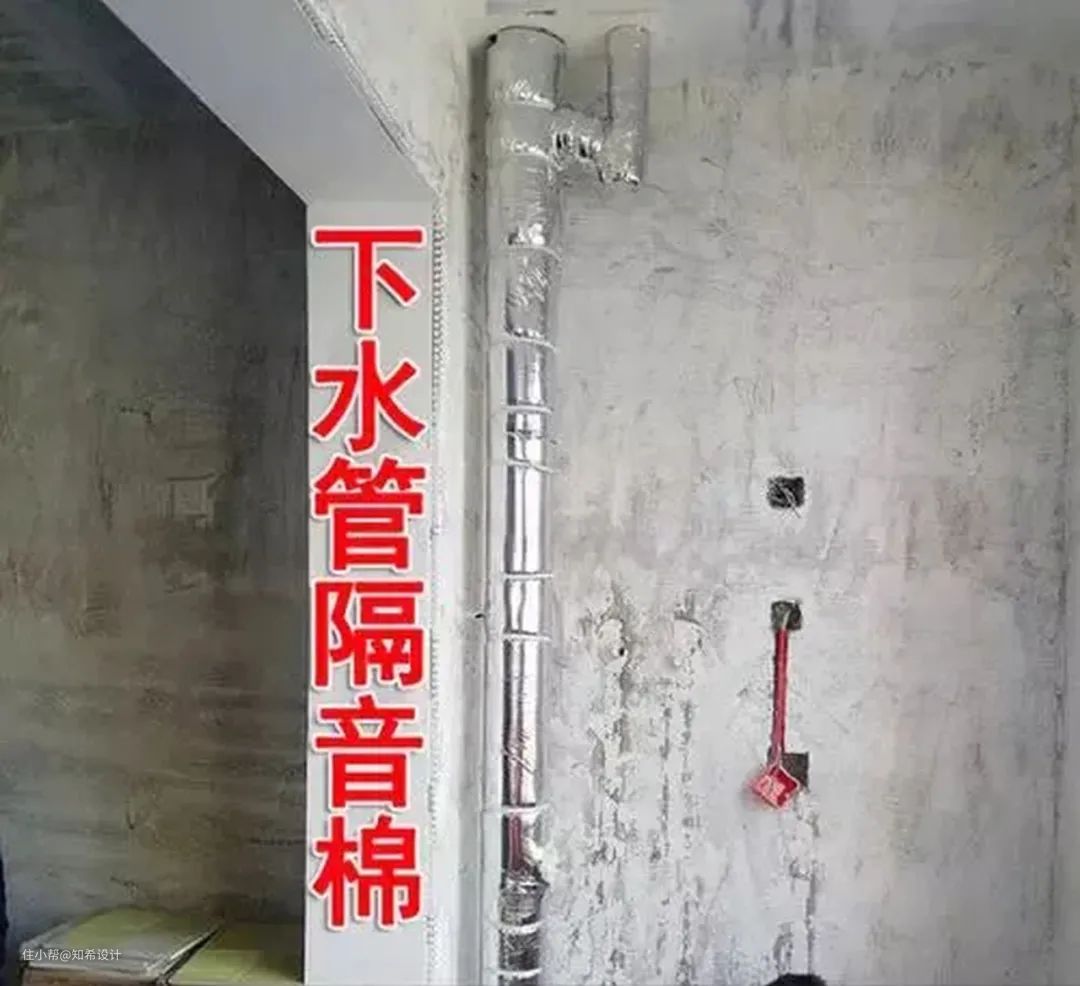 下水管道做隔音处理,先用隔音棉将上下水管道包好,同时做好地漏管道的封闭,防止下水管返臭。
