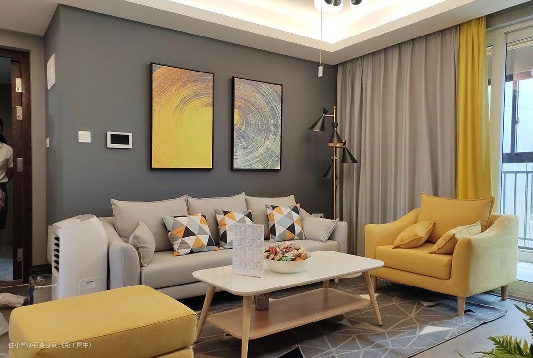 另一面是用面漆打底的灰色沙发墙,采用装饰画作为点缀,效果经济实惠还很耐看。家具也是选的简约款,柔软舒适的布艺材质沙发和座椅,光看着就想赖在上面不想走了,黄色的座椅是客厅的点睛之笔,使得整个空间更加饱满。轻巧的木质结构茶几颜值很高,让客厅空间变得更加开阔,并且上下双层的台面,也更加便于置物。