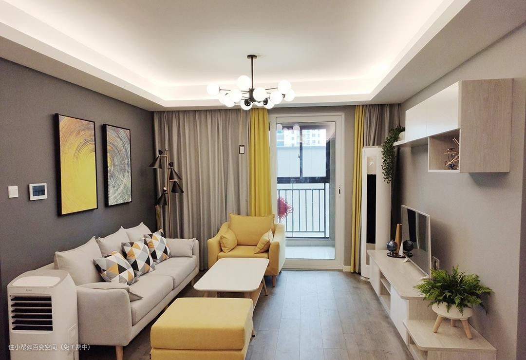 玄关进来之后,左转即是客厅区域,没有做过多复杂的造型,不过为了避免空间上的单调,还是做了一个回字形的凹槽框架吊顶,让空间变得更有层次感。