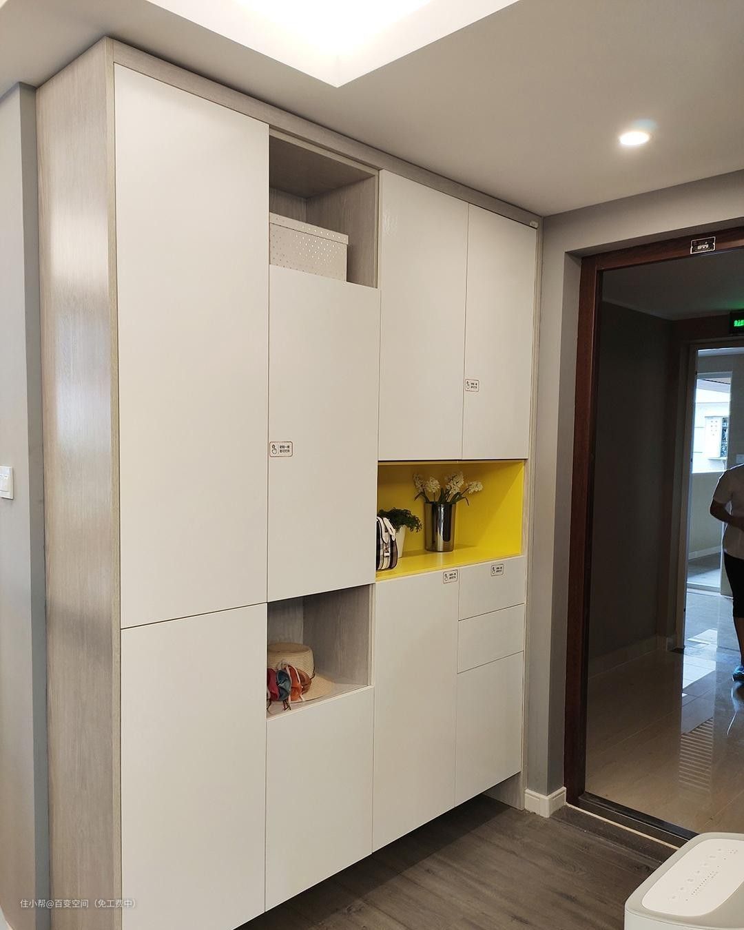 一入门进来,映入眼帘的就是这个玄关鞋柜,无把手的柜门干净整洁,鞋柜底部悬空设计非常细心,便于放置日常穿的鞋子,加上预留的开放式收纳区,也能用于存放包包或是钥匙等小物件,设计得超人性化。