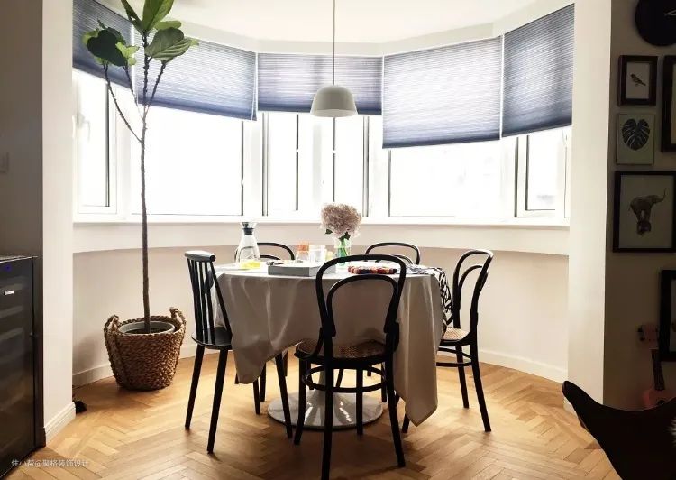 其实市面上是没有这种圆弧造型的踢脚线的,而是选择了“软木条”来装扮成踢脚线,效果还不错。