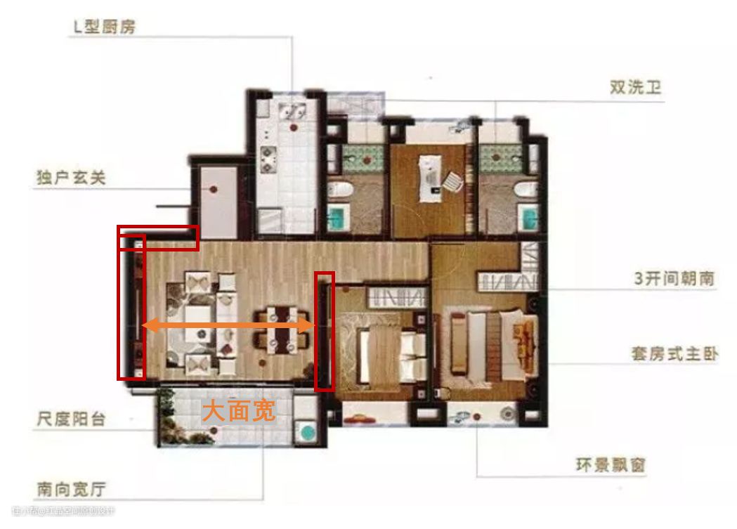 进深时, 客厅越宽敞,即我们说的横厅 ,如下图所示: