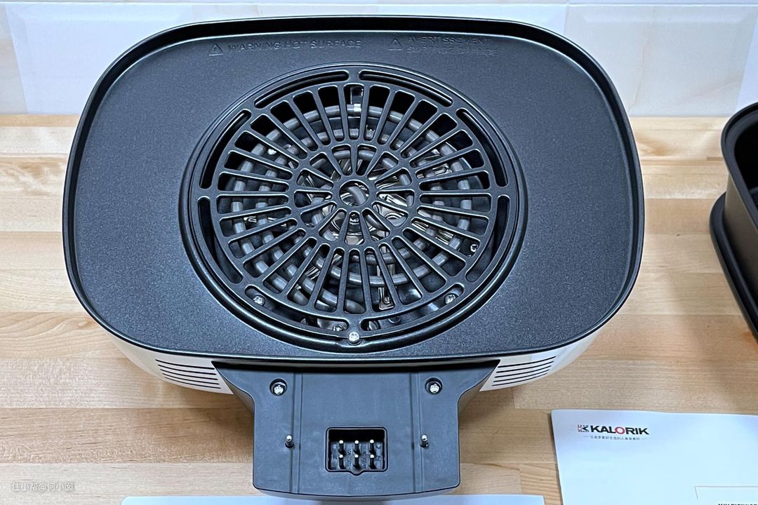 从做工和用料上来看,Kalorik凯瑞客的空气炸锅锅盖就比传统普通的好太多了,我们凑近看,首先,整个锅盖与锅体接触的这部分,全部采用的带涂层的金属材料,用料厚实,做工也很妥,在发热管上面有同样带涂层网状结构做保护,以免误触发热管受伤,同时也解决了清理的问题,就算溅油,用厨房纸巾轻轻擦,也能干干净净,而上面两款传统的空气炸锅,被溅油,可以说是完全无法清理的。。