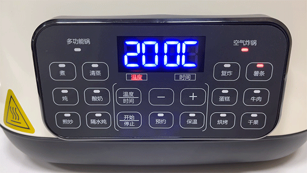 启动方式比较简单,先看看锅身上的控制区域整体分成四部分组成吧,左边是多功能锅的控制区域,功能有煮、蒸、炖、发酵酸奶、煎炒和隔水炖,中间的上半部分是显示屏,显示温度时间当前状态等,下半部分是控制区域,分别是温度时间加减,开始停止、预约和保温,对的,这个锅子还带预约和保温的功能,右边就是空气炸锅的功能键了,分别有复炸、薯条、蛋糕、牛肉、烘烤和干果功能
