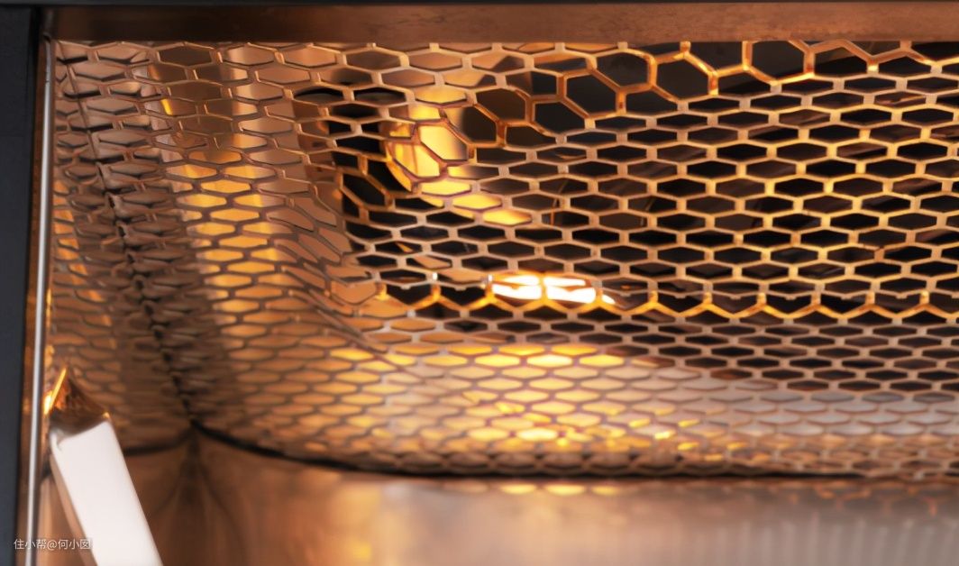 有没有发现,这种结构和空气炸锅一模一样的,我们来看看普通的空气炸锅的加热部分长啥样,这款是我们常见的抽屉式空气炸锅的上加热盘管和风机部分,外面做的蜂巢式设计,遮住发热管,以免误触
