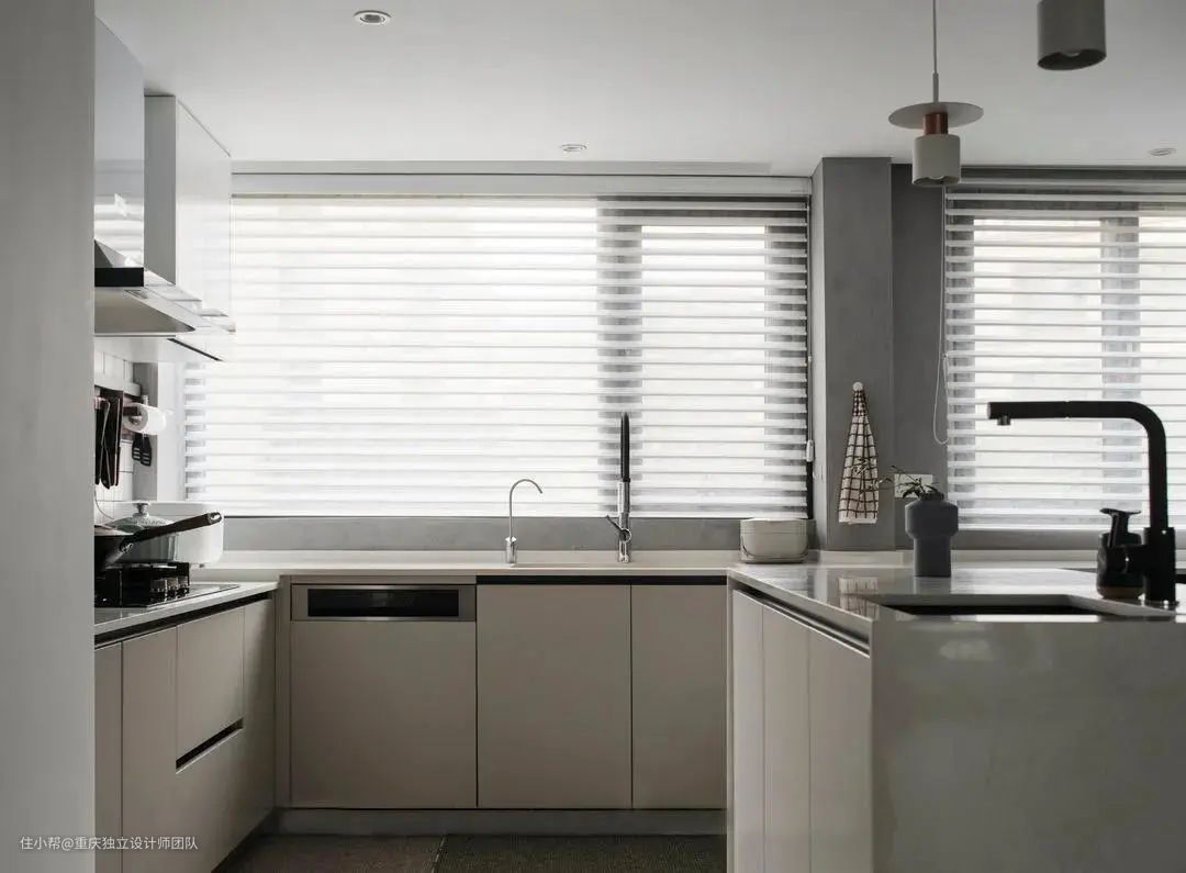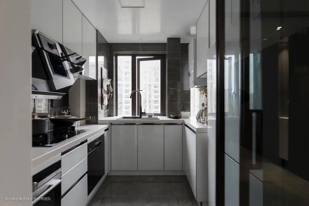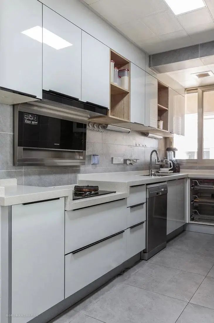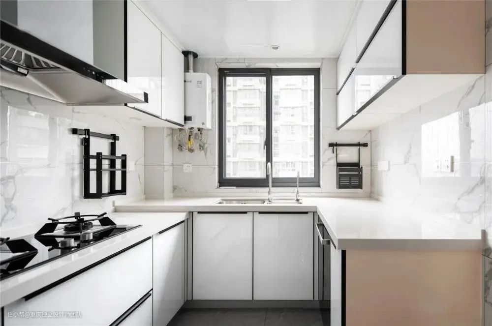 如果厨房比较方正的话,U型台面的利用率和收纳空间都是最高的!U型厨房设计高低台更灵活,遵循水槽区高于灶台的原则就ok!