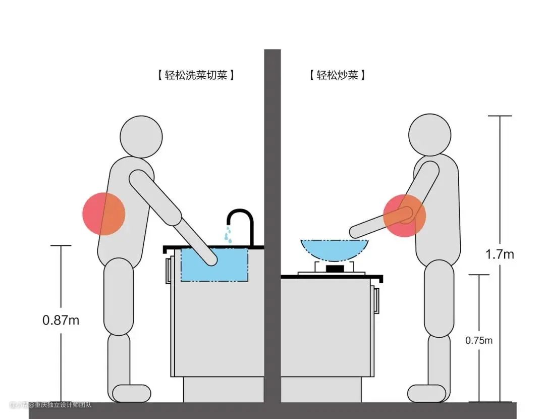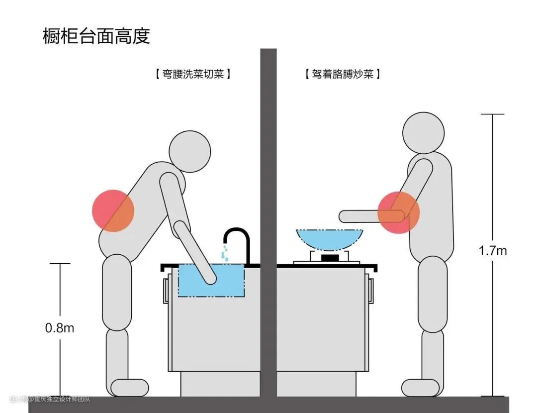 因为水槽是往下内嵌的,而灶台呢是向上的,有一定落差。从身高角度来说,台面低了对腰不好的盆友就特别不友好,高了的话又会导致胳膊酸。