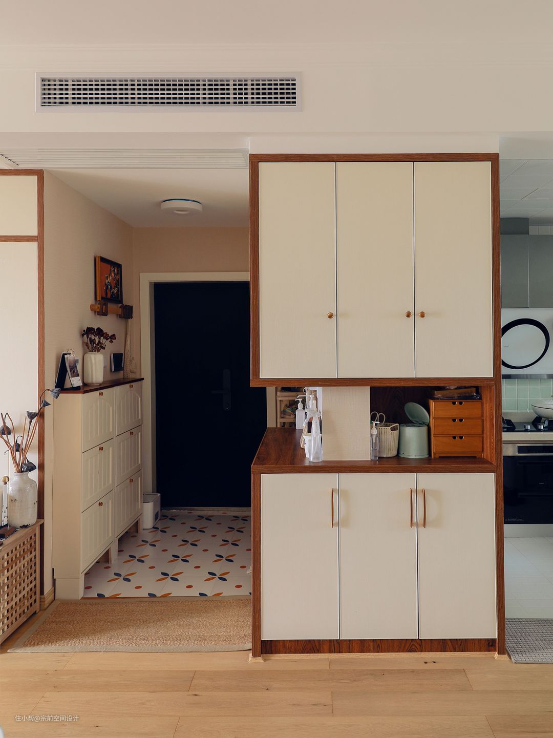 玄关柜:暖白色免漆板+胡桃色贴皮勾边