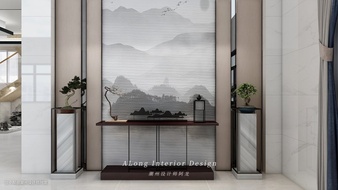 1,玄关厅区域:入户玄关厅跟客厅区域整体采用挑空处理,增大整体的视觉空间感。入户玄关门厅区域靠墙配置入户鞋柜,供日常鞋子的储存;入户门正对面设置竹木纤维搭配金属线条的新中式背景墙+端景置物。