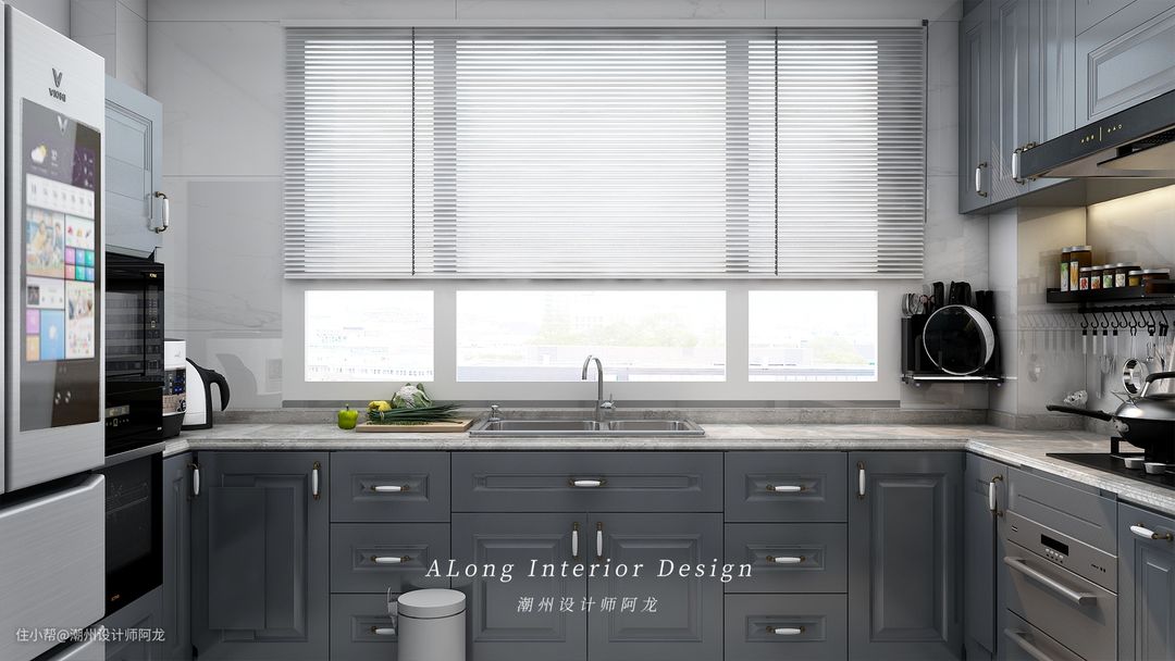 6,餐厅-厨房区域;沿着楼梯直上二楼,迎面即是餐厅区域,餐厅区域设置圆形8人餐桌椅+酒柜组合,满足家庭聚会用餐需求。厨房区域U字形橱柜设置,冰箱+烤箱+微波炉+洗碗机+消毒柜一应俱全,最大化为家庭烹饪美食添助力。