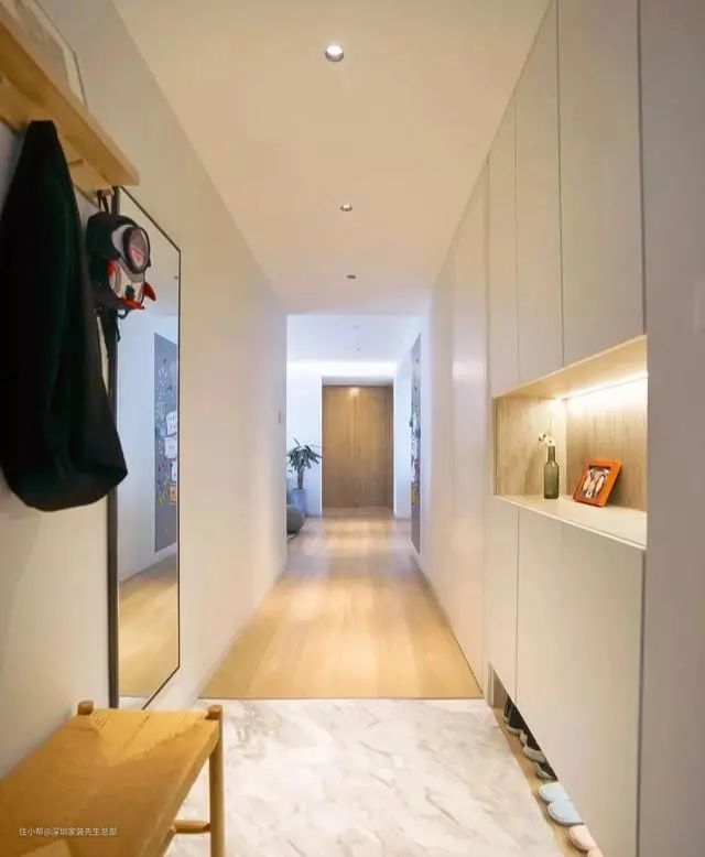打开进户门,是一个独立的玄关区域,利用与客卧之间的非承重墙做了一个嵌入式鞋柜;不占空间、方便收纳。
