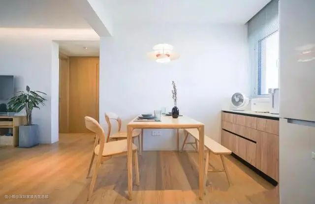 再来看看餐厅,餐边柜提供了强大的收纳功能,一盏细线吊灯把餐厅衬托得精致又极简,很有用餐仪式感。
