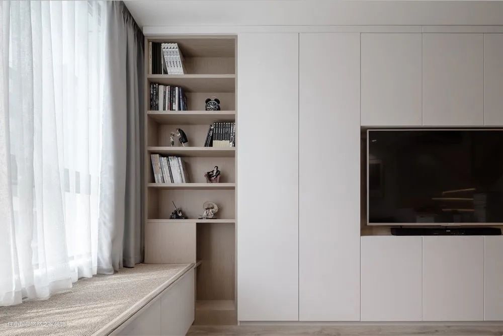 靠近窗户设计了一组展示柜,用来摆放书籍,便于平时坐在飘窗随手取阅。