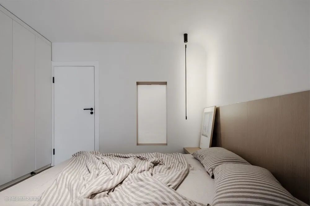 卧室采用简约风设计,由于层高关系,舍弃成品床铺,选择无脚落地床,避免压抑感。