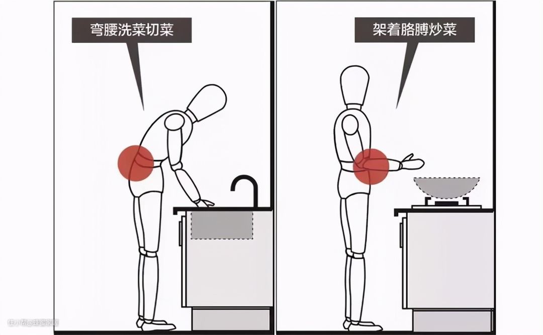 做饭时,洗切煮都离不开灶台,不少人都反应自家厨房灶台在使用时容易腰酸背痛,这是因为灶台的设计尺寸有问题导致。