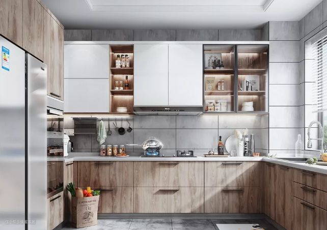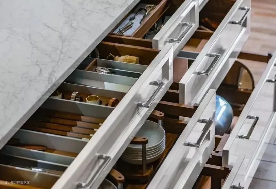 5.橱柜的合理规划:厨房收纳做得好,烦恼才更少。根据厨房用具的种类和尺寸,将橱柜做成不同大小的分割,收纳整理会更加便捷。