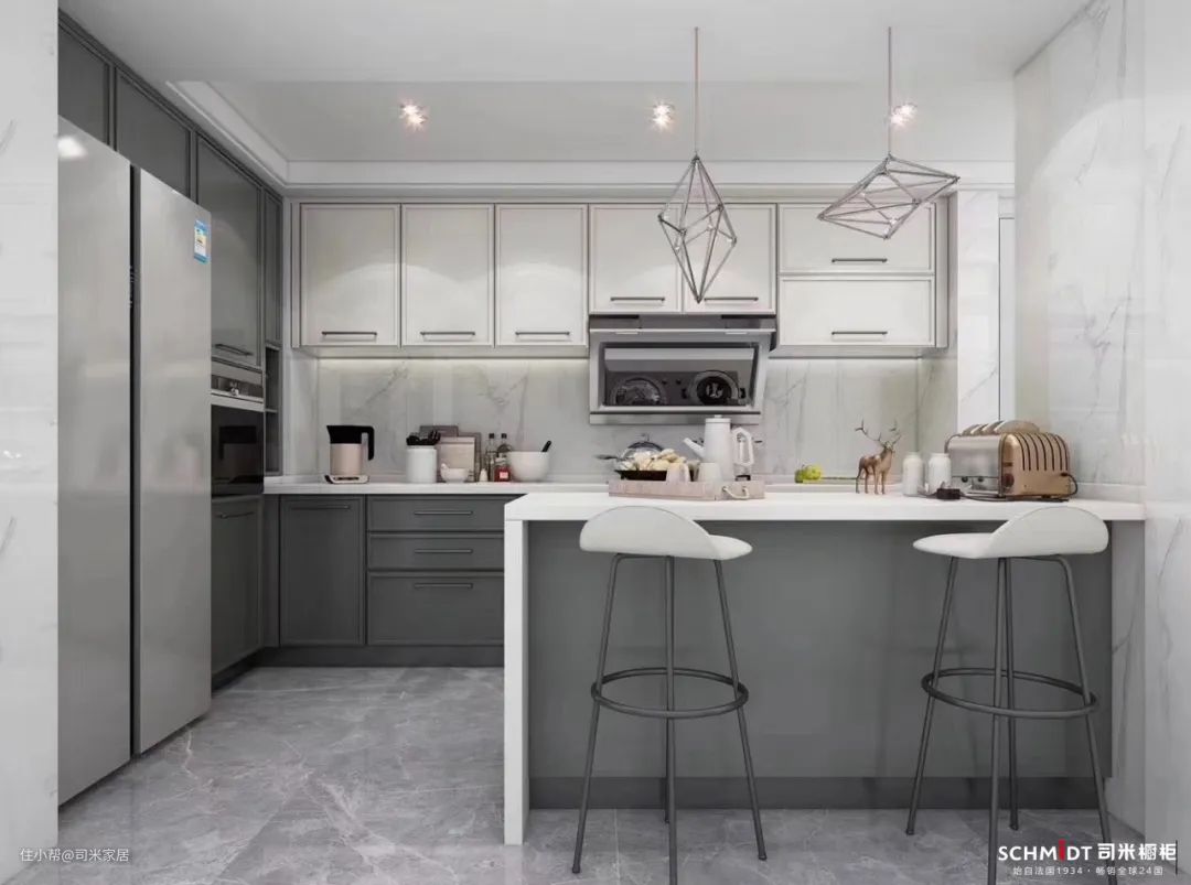 灰色厨房邂逅白色台面,让厨房更加简约舒适。亮色系白同样能够在小空间厨房使用,能够在视觉上让厨房更大,延伸厨房空间。