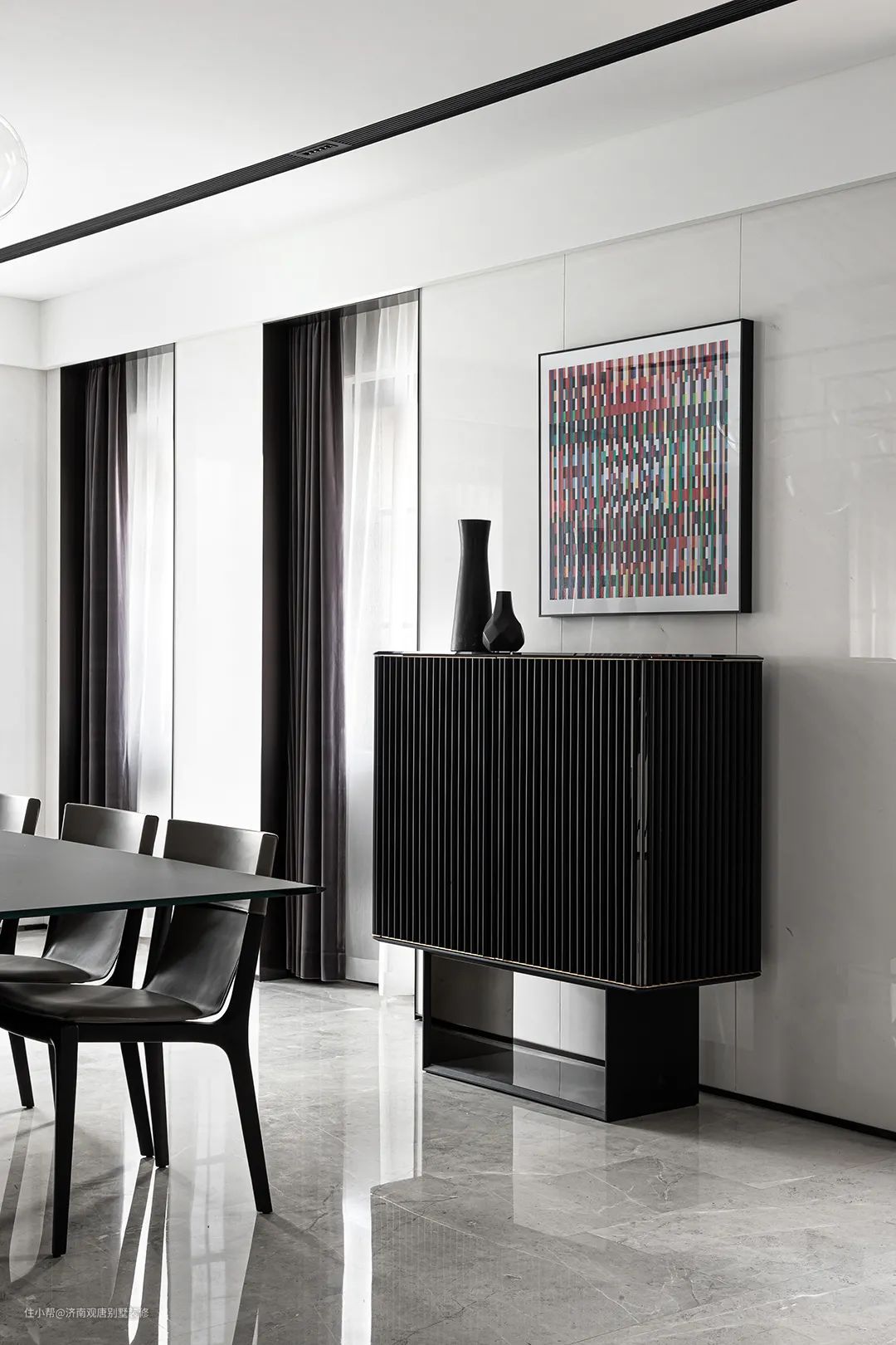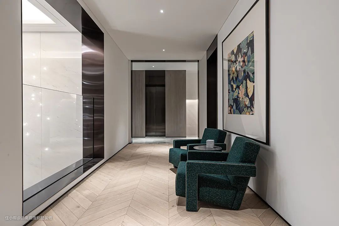 入户玄关将这种极简的设计理念充分演绎,原本静态不透明的建筑体,分解为透明的、流动的、具有纵深感的空间,超越于居住成为情感和精神的释放。安全感与私密性兼具,保持通透性的同时,玄关的屏障体现出一种节制性。艺术品、水晶吊灯打破平稳和理性,让人直面丰富的情绪。