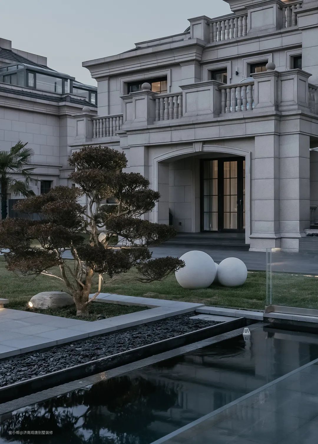 精心种在石缝间的草,石板铺就,没有阴翳幽森,每一寸阳光肆意地洒在广阔的庭院里,别致的树木,似是一种精神象征,在平坦中姿态挺拔。水景周围,自然与人作取得恰到好处的平衡,彰显出一种顶级豪宅的审美意趣。