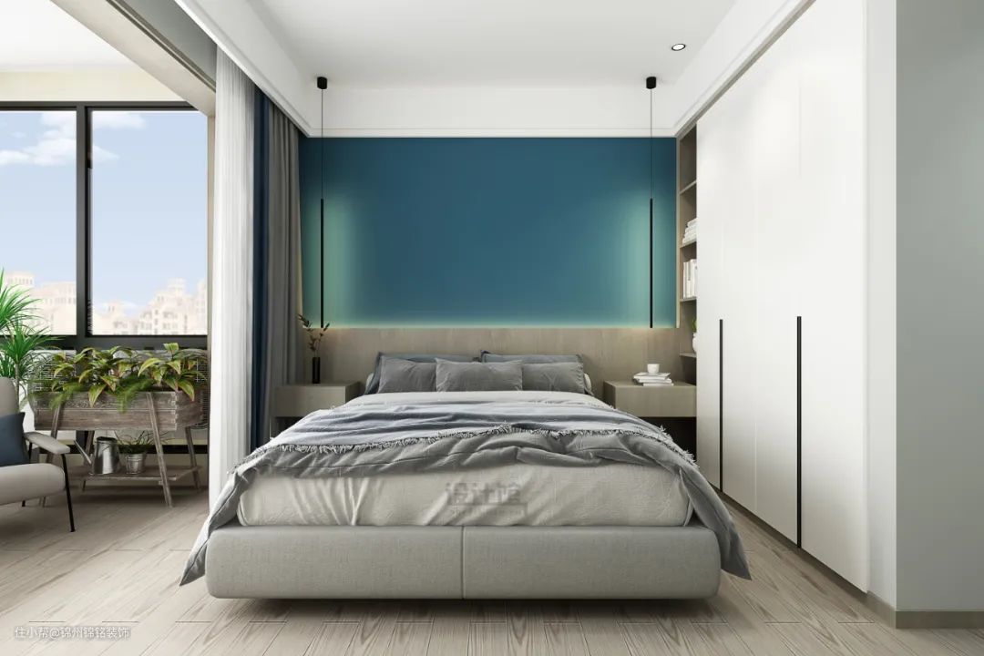 卧室空间较小,在布置卧室的大件家具时,不能仅考虑好看,把好看的家具都搬进去,这样容易导致卧室的动线拥挤,影响我们在卧室里的日常生活。比如在衣柜与床之间,就要留出足够的距离,一方面是保证人的进出通行,一方面也是要保证我们衣柜开启使用的方便。