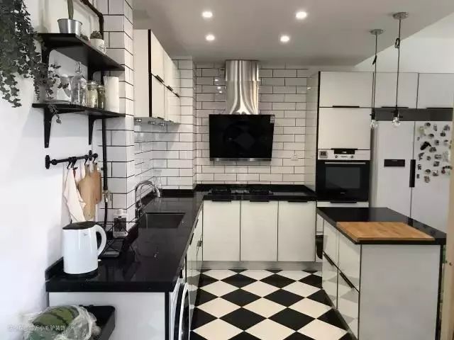 另外,为使厨房风格统一,有些业主很喜欢在顶吸式抽油烟机外部做吊柜将其包起来。就像这样↓