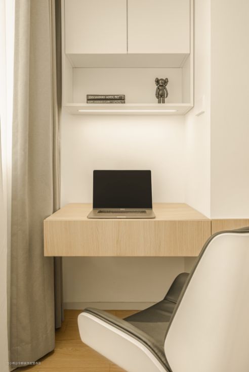 连接主卧的南阳台,一侧布置了女主人的梳妆台,一侧成为了男主人的办公区。鉴于男主人长期在家办公的工作需求,设计师选择了全屋光线最好的位置,搭配舒适的办公桌及符合人体工学的办公椅,即使在这里工作一整天,也不会让身体感受到压迫感。
