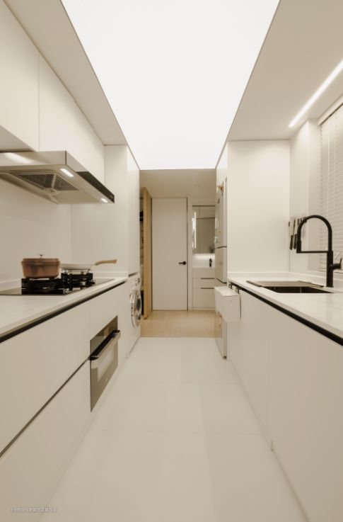没有光源就创造光源。厨房位置设计了软膜天花模拟自然光,仿佛阳光直接从天井洒下,干净、纯粹的补充了厨房的光线,点亮了昏暗的小角落。原本房间最暗的部分摇身一变,成为了让女主人最为惊喜的地方。