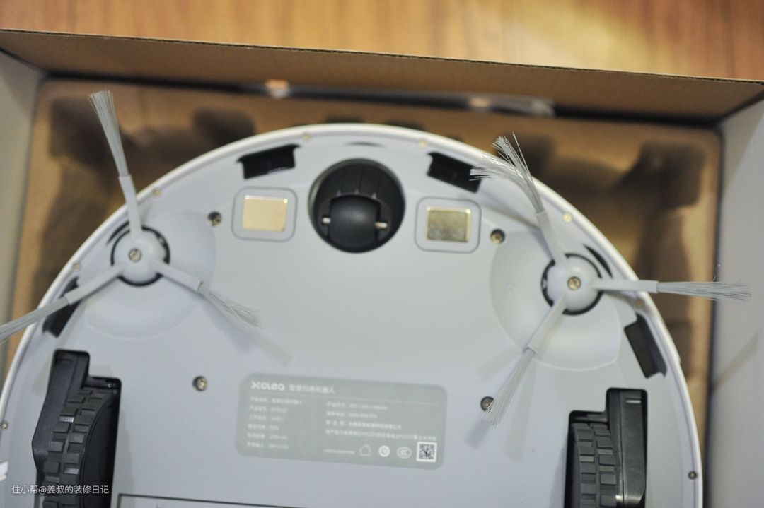 再看下底部结构,很良心的是这款机器人采用了双边刷,要知道很多扫拖一体的机器人为了节省空间,只保留了一个边刷,从清扫效果来说,双边刷清理的范围会比单边刷更大一些。