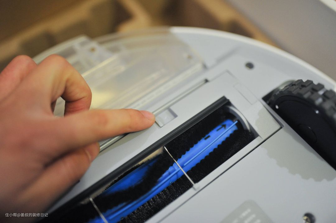 下面就说它的清理模块,底部的采用了V型滚刷,这种造型可以让地面垃圾能够被有效地清理掉,拆卸也很方便,通过下面的锁定卡扣就可以轻松取下,清理也很简单。