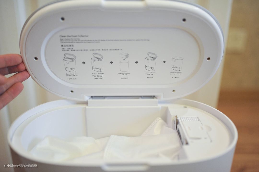 好用,最大的感受就是终于不用在手动清理尘盒了,在机器人清扫完成后,它返回基站进行自动集尘,大概持续十来秒,集尘完成。下面是清理前的尘盒情况,可以看到里面还是有很多垃圾的,在完成集尘后可以看到尘盒里基本看不到垃圾,集尘效果还是很明显的,下图动图为自动集尘时尘袋的状态,实际上要在关闭盖子状态下才能自动集尘。