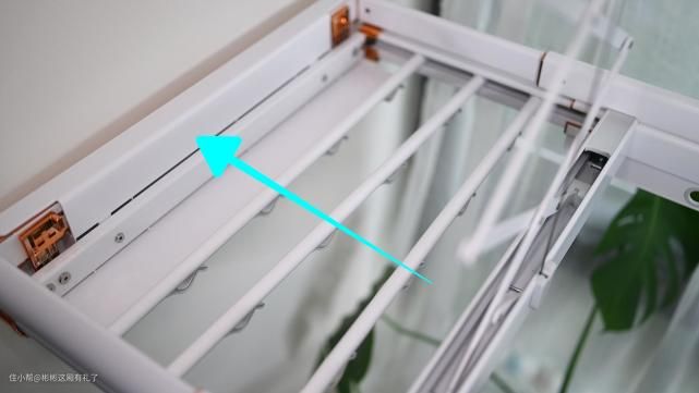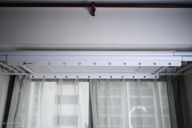 ▲在众多自动晾衣架产品里,邦先生M31体积算小的,收纳之后主机厚度才97mm,不到10厘米,在天花板的存在感并不高,不占用宝贵的居家空间,不会有那种天花板太低而造成的压抑感。X型折叠支架的材质貌似是不锈钢,垂直方向加一根加强钢丝,使得晾衣架的承重能力更强。