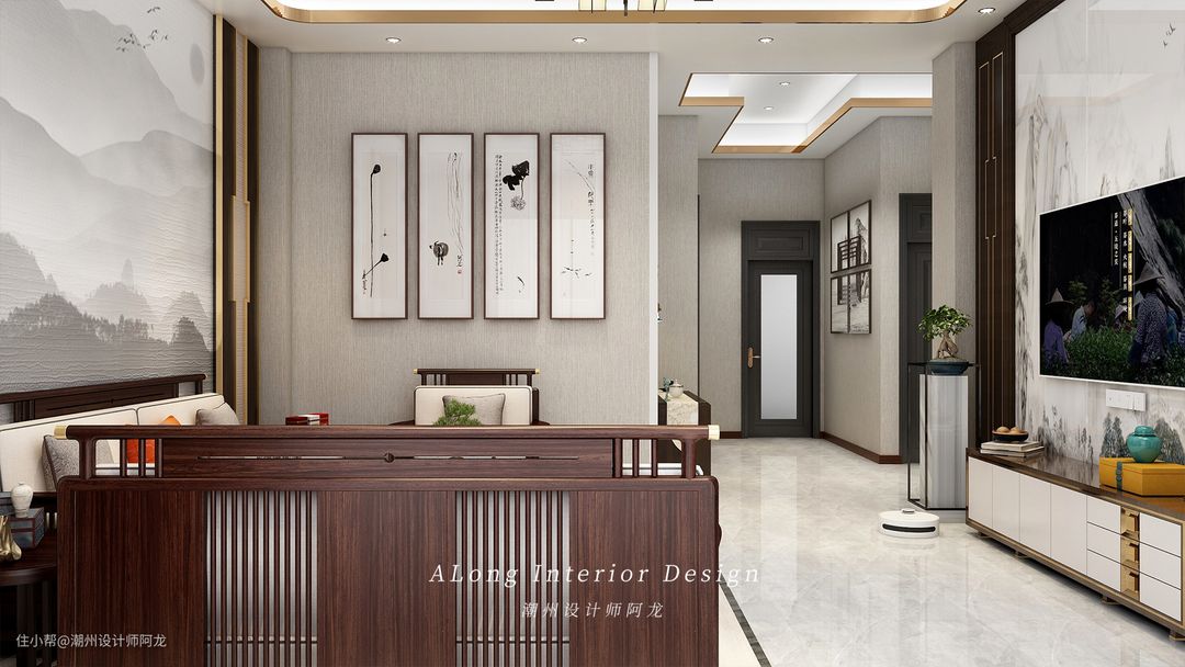 1,四层过道厅区域:经过入户防盗门,过道厅与客厅之间设置了一个新中式玄关端景柜,作为一景观景点同时也满足日常小物件的储物需求。