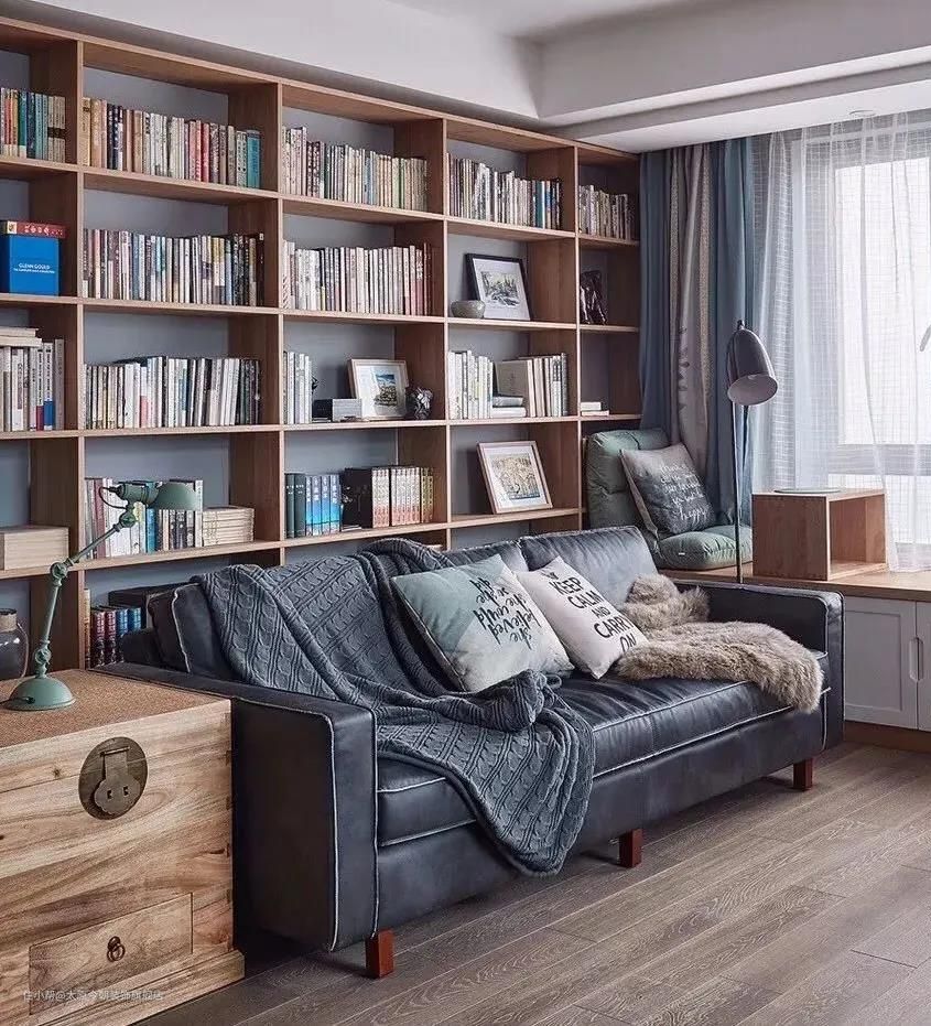或是直接把阅读功能作为客厅的重心设计,将书架摆放在更加合适的位置。