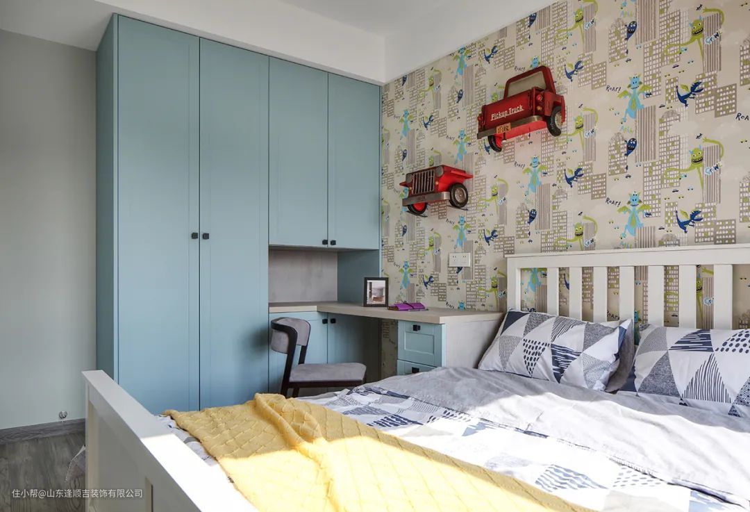 ▲儿童房的床头墙是贴着卡通图案的墙布,上面挂着两个立体汽车小饰品,搭配淡蓝色的衣柜与抽屉柜、白色木栏靠背的床铺,显得童趣而舒适。