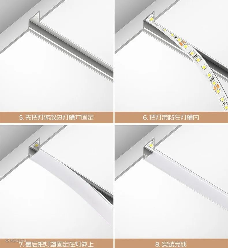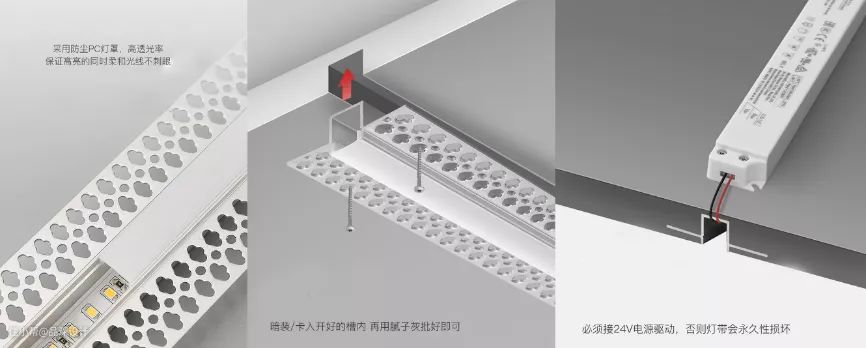 安装流程:板材开槽→固定铝槽→放置灯带→盖上PC面罩→灯光调试。