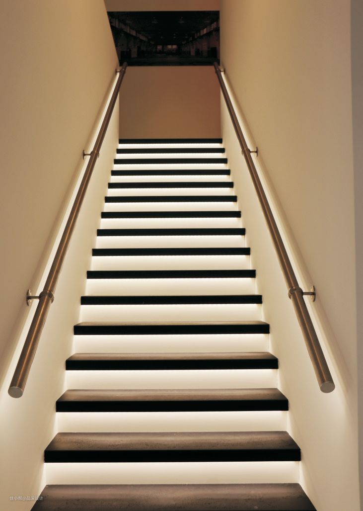楼梯间的线性灯具属于间接照明,夜间照明与引导作用,也能使空间有层次感。