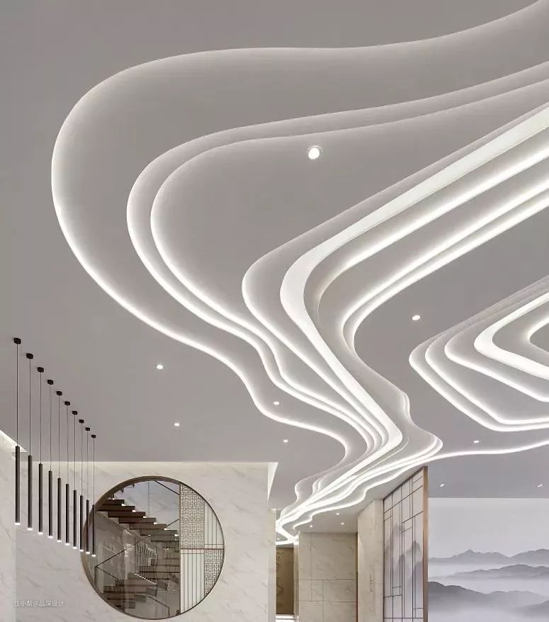 利用灯光设计来构筑自由的、灵动的、富有想象力的气质空间,而且可以通过隐藏的形式弱化自身存在感,沿着相应的空间轮廓渐次排布开来,与墙体一起凹出独特的几何或曲线造型。