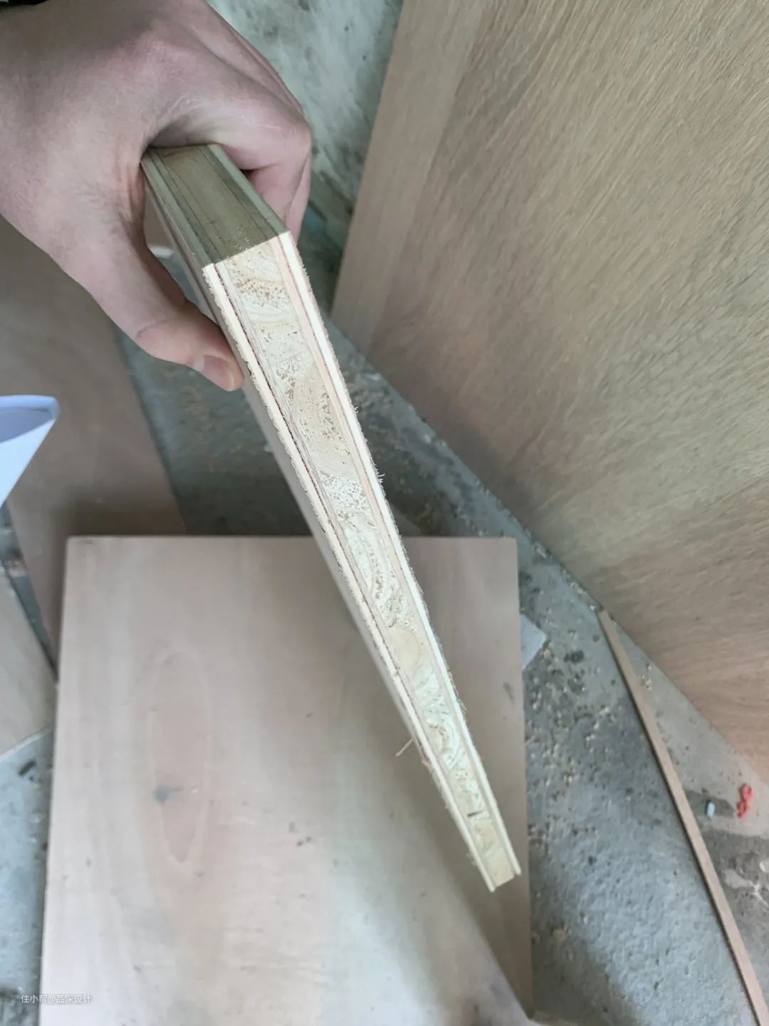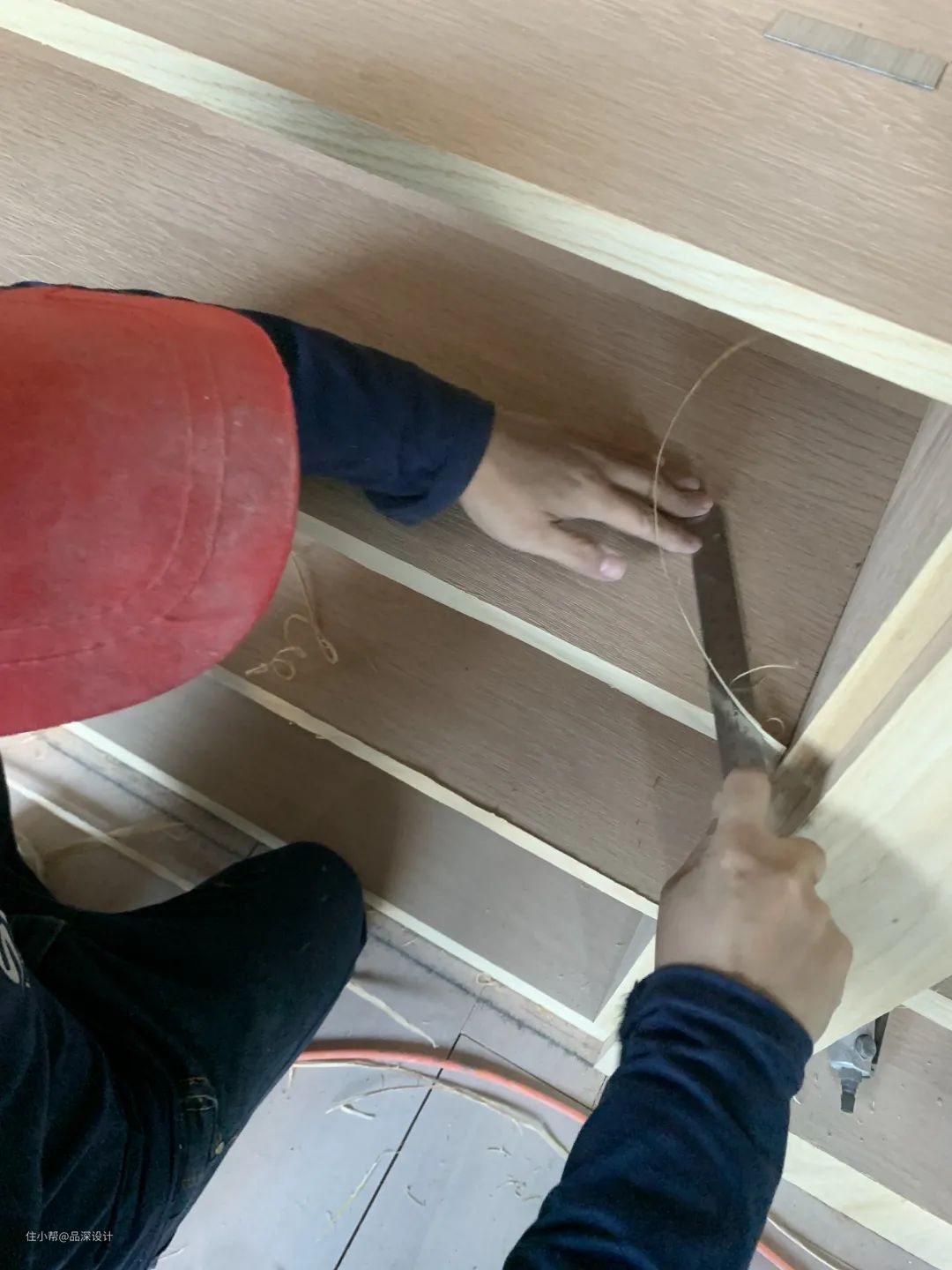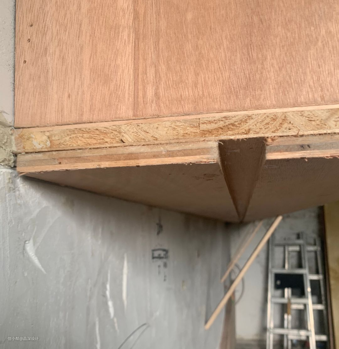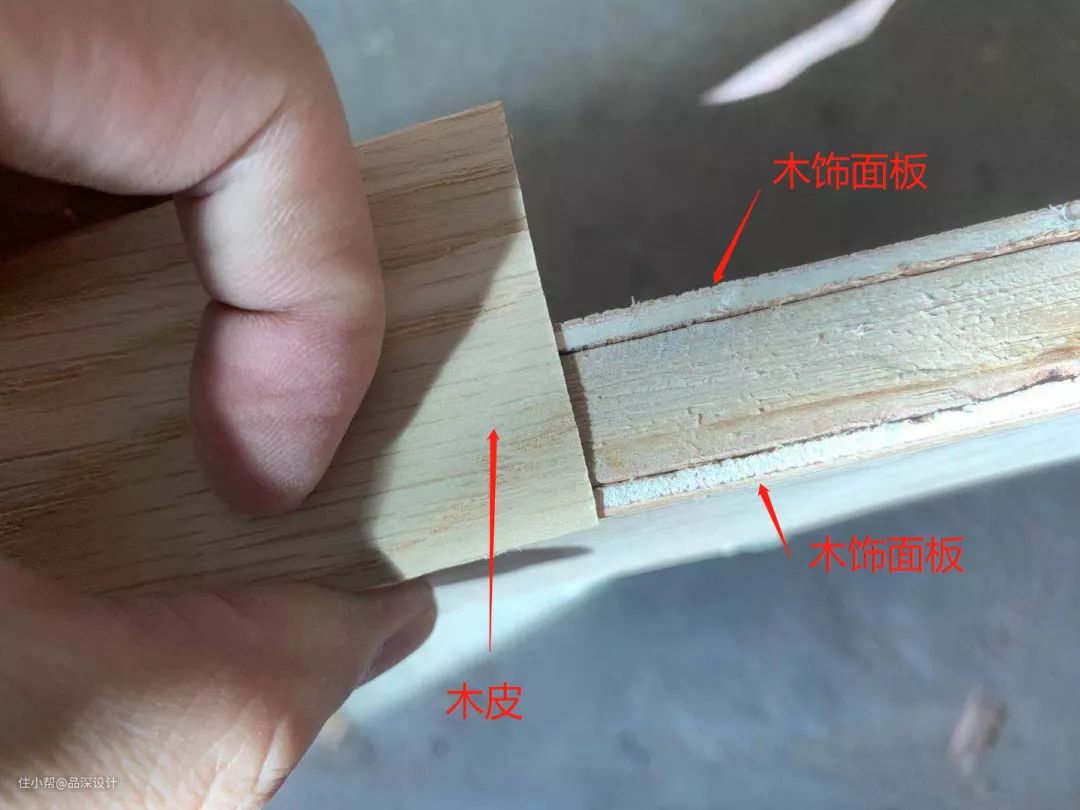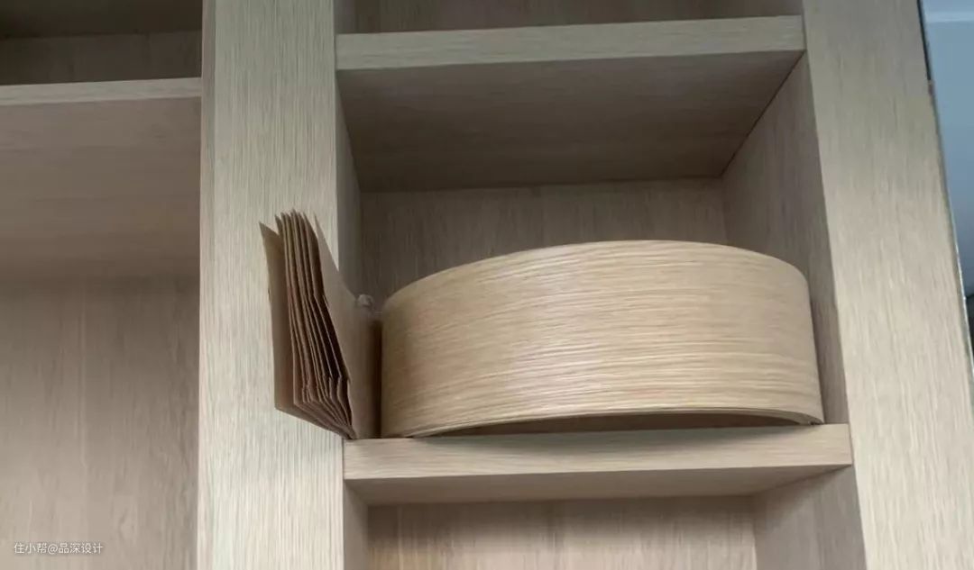 之前有小伙伴有以上问题留言,关于这个问题,特意请教过现场木工师傅,说法是在大的面用木饰面板去做,正面和窄的面用木皮去贴,通常是用木饰面做好侧面,正面再用木皮收。