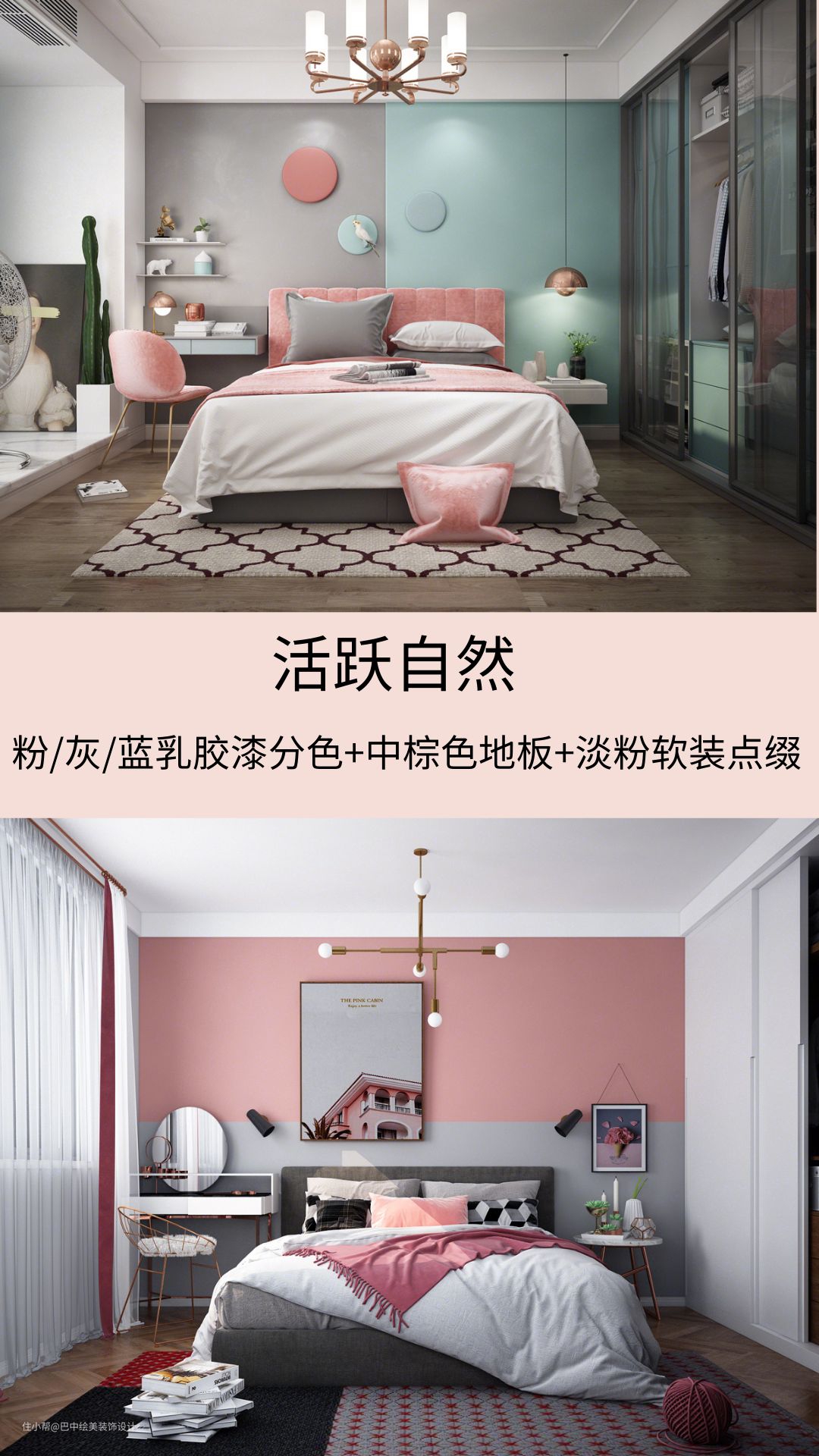 粉/灰/蓝乳胶漆分色+中棕色地板+淡粉色软装点缀
