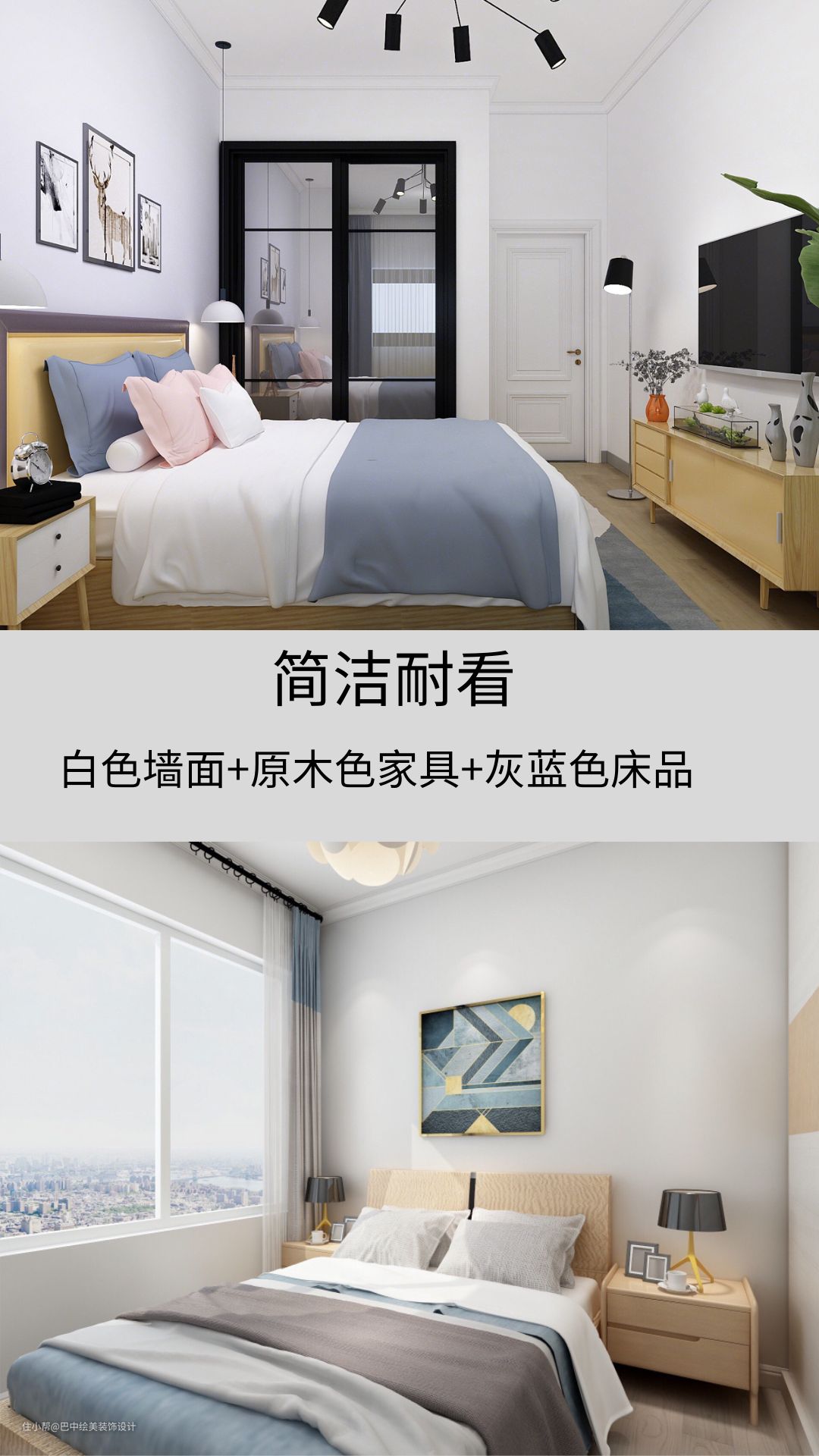 淡蓝色净面墙布+深色地板+蓝灰色床品