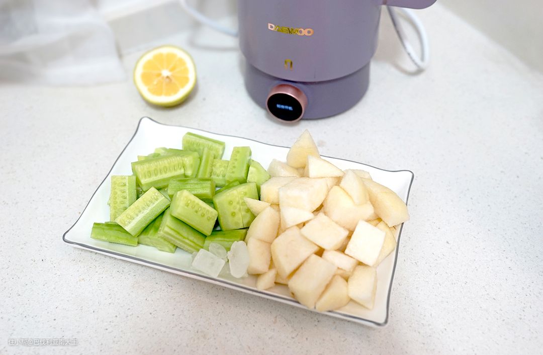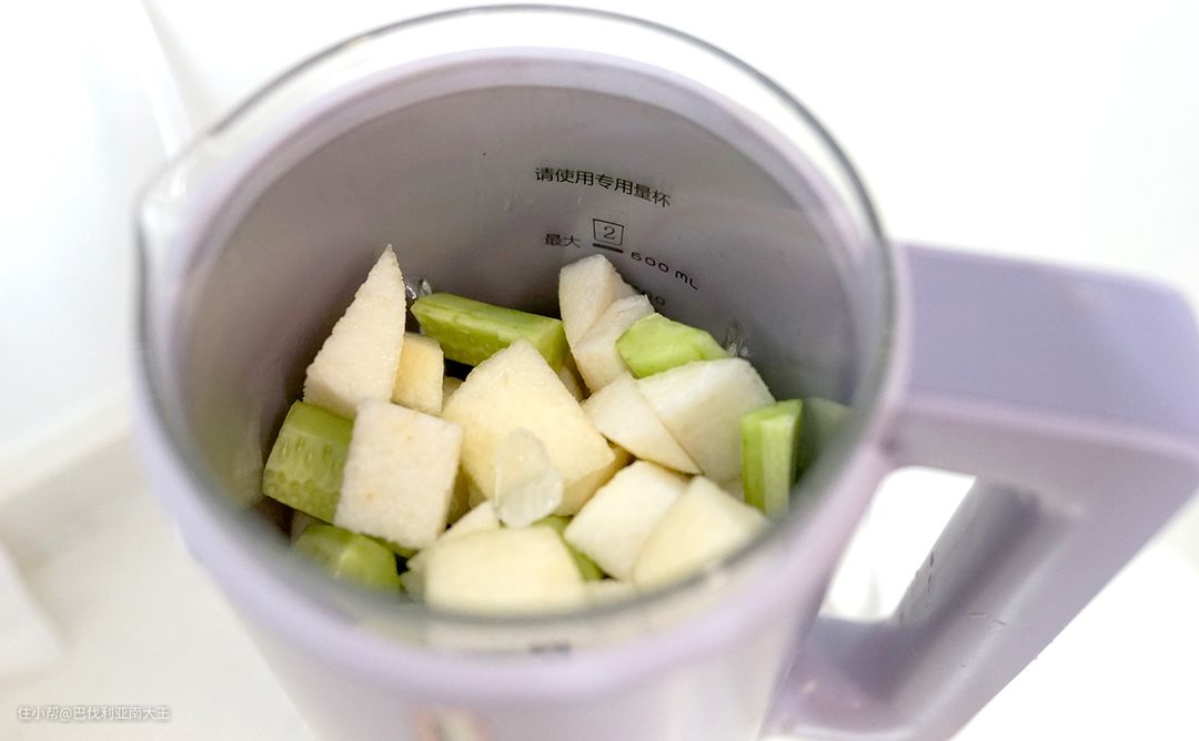 1. 黄瓜和雪梨去皮切块,统统加入破壁机中,同时加入150ml水。