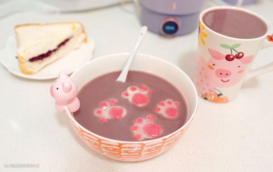 接下来把破壁机里煮好的红豆汤倒出来,猫爪铺上,就可以吃啦,早上喝这一碗胃里都暖呼呼哒~
